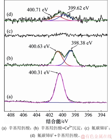 图13 辛基羟肟酸、辛基羟肟酸铈沉淀物及辛基羟肟酸作用前后氟碳铈矿N 1s XPS 窄谱