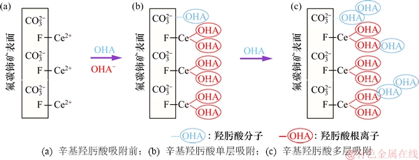 根据以上实验及测试分析,可推测辛基羟肟酸OHA在氟碳铈矿表面的吸附过程如图14所示。由图14可知:辛基羟肟酸在氟碳铈矿表面同时发生化学吸附和物理吸附,辛基羟肟酸对氟碳铈矿的吸附作用机制:1) 羟肟酸根阴离子OHA-与氟碳铈矿表面暴露的Ce3+发生螯合反应生成OHA-Ce沉淀,形成化学吸附;2) 羟肟酸OHA分子中的氢与氟碳铈矿表面