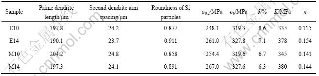 为循环稳定时的总应力半幅;E为材料的弹性模量;K为循环强度系数,K大则材料的强度高;n为循环应变硬化指数,可用来表征材料循环硬化的快慢程度和抵抗塑性变形的抗力,n大则材料的循环硬化速率越快,其塑性变形的抗力大,塑性较差。通过对实验结果和图1中应变—应力数据进行一元线性回归分析,可以模拟出本实验4种A356合金σ—ε关系的K和n参数值(见表2)。由表2可见,除E10外,其余3种合金的n值均在0.14~0.15之间,与大多数金属的试验结果一致(n=0.1~0.2),也与LANDGRAF[11]的研究结果一致。通常金属材料在低周疲劳中的循环硬(软)化行为与其静拉伸行为有关,金属或合金在循环硬化指数n<0.1时发生循环软化,在n=0.1时循环稳定,在n>0.1时循环硬化[11]。