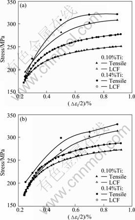 Fig.3 Cyclic ?ε/2—2Nf plots of A356 alloys: (a) By electrolysis; (b) By melting Al-10%Ti master alloys