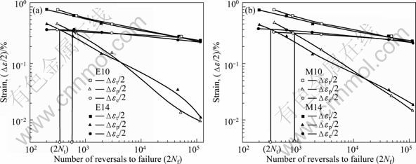 表2中,E10与M10、E14与M14的K值相当,表明二者的强度相当,而E10的n值远小于其余三者的,这是由于E10合金具有较高的塑性。n值较小表明其循环硬化速率较慢,塑性较好,抗疲劳循环硬化的性能好。一般来说,在恒应变幅循环下,若材料是循环硬化型的,则材料所受应力幅将越来越高,可能引起受载构件的早期断裂。