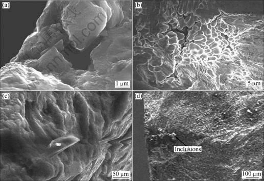 Fig.4 Crack initiators of fatigue failure for A356 alloys: (a) Si particles cracking; (b) Pores; (c) Oxides; (d) Inclusions