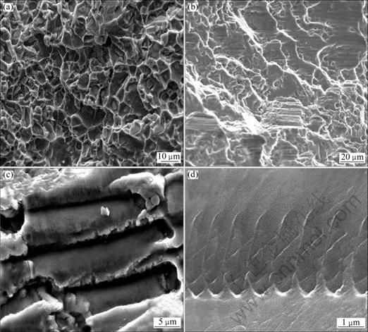 Fig.5 Fractographs of EA356 alloys after fatigue failure: (a) Fracto-dimples; ?εt/2=0.7%; (b) Fracto-flats, ?εt/2=0.3%; (c) Fatigue striations, ?εt/2=0.3%; (d) Fatigue slipbands, ?εt/2=0.3%