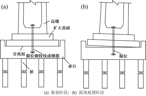 摇摆隔震装置通过竖向荷载(结构自重)平衡水平荷载(风、制动力及多遇地震作用)满足正常使用,此时按岩石地基上的扩大基础进行设计。强震下当墩底地震弯矩超过恒载等提供的抗倾覆弯矩时墩底的一侧相对于桩基础产生竖向的位移,发生提离(图1(b))。提离后绕另一侧摇摆,桥墩利用提离摇摆达到隔震目的,震后靠自重实现完全复位。为避免摇摆过程中墩顶产生较大位移,可通过钢筋限位。墩底的扩大基础通过局部配筋、黏角钢及倒角等细部构造措施可避免提离时由局部应力集中及承台与扩大基础的刚性碰撞造成墩底扩大基础严重损坏。