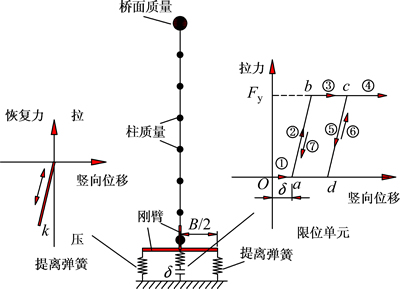 模型中弹性梁单元模拟墩柱,集中质量模拟桥跨重,刚臂单元模拟承台及墩底扩大基础,基础质量堆积于扩大基础的重心,模型采用瑞利阻尼,提离弹簧只受压,刚度按下式近似计算[12]: