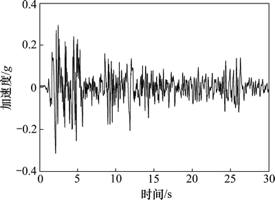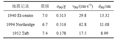 从美国太平洋强震数据库(PEER)[13]选取了1940年Imperial Valley地震El-Centro记录为输入地震动(见图4)。为考察摇摆反应的离散性,还另外选取了1994年Northridge和1952年Kern County地震Taft记录。