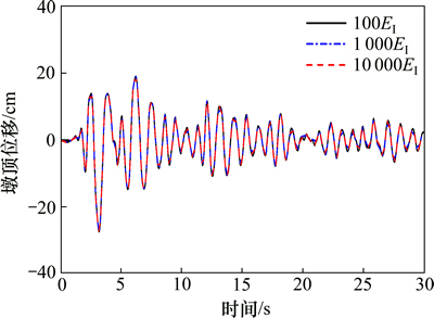 Fig. 5 Comparison of displacement time-history of pier top at different stiffnesses of rigid beam