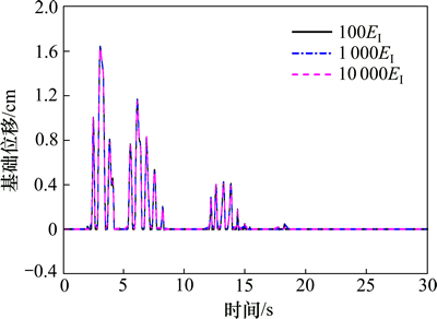 由图5~7及表2可以看出:当基础刚臂在100EI~ 10 000EI之间取值时,墩顶位移、基础提离位移及墩底弯矩的反应峰值及时程曲线重合较好、受基础刚臂抗弯刚度的影响较小,即数值分析时对此参数的变化反映不敏感。以下分析中均取基础刚臂为100EI。