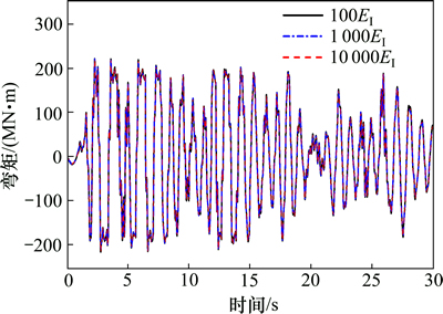 Fig. 7 Comparison of moment time-history of pier base at different stiffnesses of rigid beam