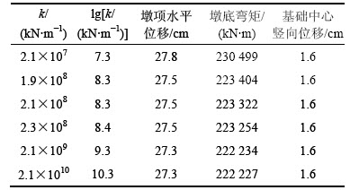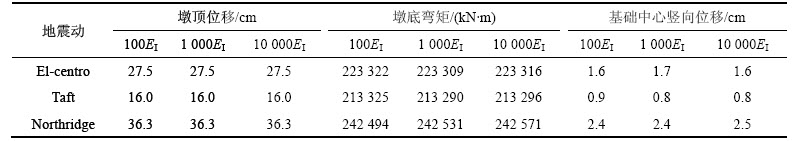 由表3可以看出:当弹簧刚度k=2.1×108 kN/m变化±10%,即弹簧刚度分别取2.3×108 kN/m和 1.9×108 kN/m时,若只考虑1位小数点则墩顶位移与基础中心的竖向位移无变化;而墩底弯矩则对应减小了0.03%和增大了0.04%。这表明,弹簧刚度变化10%时,对摇摆反应的影响极小。由表3还可以看出:基础中心的竖向位移为1.6 cm小于限位钢筋的初始间隙10 cm,表明满足前面不考虑限位钢筋的假定。
