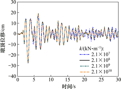 由图8可以看出:除最小提离弹簧刚度的时程曲线外,其余3个基本重合、但振动幅值不同,这表明弹簧刚度在1.9×108~2.1×1010 kN/m之间变化时对桥墩摇摆振动周期特性影响很小,对摇摆振动的剧烈程度有一定的影响。由图9及表3可以看出:墩顶位移及墩底弯矩随着弹簧刚度的增大而减小,但当弹簧刚度增大到2.1×109 kN/m以后,墩顶位移及墩底弯矩基本不变。弹簧刚度由2.1×107 kN/m增加到2.1× 1010 kN/m时,墩底弯矩由230 499 kN/m减小到222 227 kN/m减小了3.6%,墩顶位移减小了1.8%。Taft波与Northridge波下也有此规律,其结果没有单独列出。这是因为墩顶位移主要取决于桥墩自身弹性变形与提离转动引起的刚体位移。桥墩的水平弹性变形及刚体位移受提离弹簧承压刚度的影响主要表现在摇摆振动产生的桥墩水平弹性变形(有动力放大)及提离转动引起的刚体位移。提离弹簧刚度越小、桥墩的摇摆振动越剧烈,动力放大作用相对明显,体现为图8、图9及表3中的较大位移振幅及墩底弯矩。墩底弯矩主要由桥墩的提离摇摆条件决定,与桥墩的提离弹簧刚度有关是因为摇摆振动时引起的抗倾覆弯矩动力放大,所以,较小地提离弹簧刚度对其影响相对较大。总体来看,通过提离弹簧刚度的变化,即桥墩下承台材料特性的调整,可在一定程度上控制桥墩的摇摆反应。