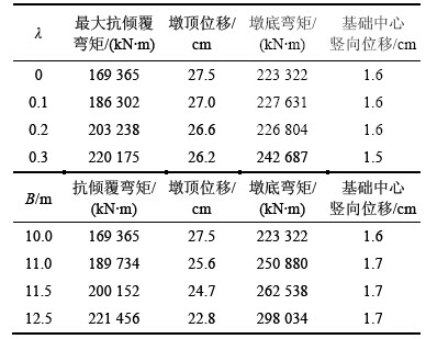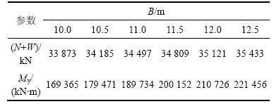 由式(4)可知:竖向荷载(N+W)与计算方向的基础宽B是抗倾覆弯矩My的2个决定因素。当基础宽度B发生变化时,抗倾覆弯矩My也随之发生变化。为保证尺寸改变也满足正常使用,本节采取逐渐加大基础宽度的方法来改变抗倾覆弯矩,见表4。分析中,提离弹簧的刚度k=2.1×108 kN/m保持不变,限位钢筋的初始间隙与前节相同。模型中考虑承台尺寸改变引起的承台质量效应影响。