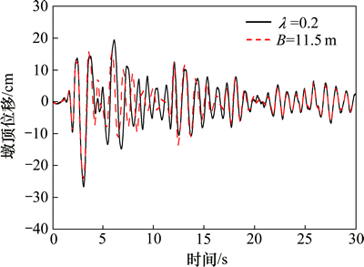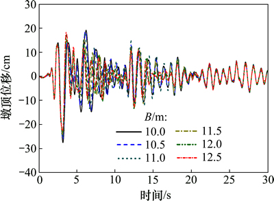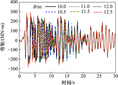 由图10和图11可以看出:随着基础宽度的变化,墩位移及墩底弯矩时程曲线也发生了变化。这是因为基础宽度的变化引起墩底抗倾覆弯矩发生变化,从而导致摇摆振动特性的改变,故反映在时程曲线上有幅值不同及波峰与波谷形状不重合。
