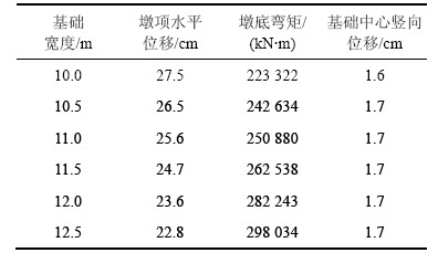 1) 基础宽度越小,摇摆振动越剧烈;墩顶位移随基础宽度的增大呈线性减小,墩底弯矩随基础宽度的增大呈近似线性增大。通过改变基础宽度尺寸可控制桥墩的摇摆反应。
