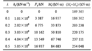 由图16和图17及表7可以看出:墩顶位移随λ的增大而减小,均有明显的线性关系;当λ为0~0.2时,λ对墩底弯矩的影响较小,但当λ为0.2~0.5时墩底弯矩随λ的增大而增大,其他2条波下也有以上规律。这表明,当λ小于0.2时,不仅墩顶限位效果较好、而且对墩底弯矩的影响也较小。