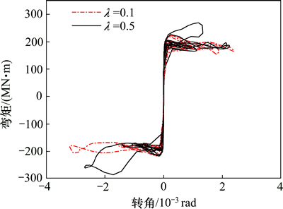 由图15可以看出:λ=0.1时的基础底面中心的弯矩-转角滞回关系曲线为反“z”形,耗回曲线的面积较小、耗能能力极小;而λ=0.5时的基础底面中心的弯矩-转角滞回关系曲线为“旗帜”形,有一定的耗能能力。这表明,摇摆桥墩的耗能能力随λ的增大而增大。