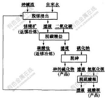 对于锑碱性精炼中产出的砷碱渣,由于亚锑酸钠、锑酸钠不溶解于水,因此,容易把它们与砷酸钠等可溶性钠盐分离开。二氧化碳与碳酸钠发生反应形成碳酸氢钠,而碳酸氢钠的溶解度远小于碳酸钠的溶解度,因此,向脱锑液中通入二氧化碳气体,可以脱除脱锑液中大部分碳酸钠。向脱碱液中加入硫化钠溶液,在酸性条件下可沉淀出砷的硫化物。向脱砷液中加入过饱和的氢氧化钡溶液,析出硫酸钡沉淀。