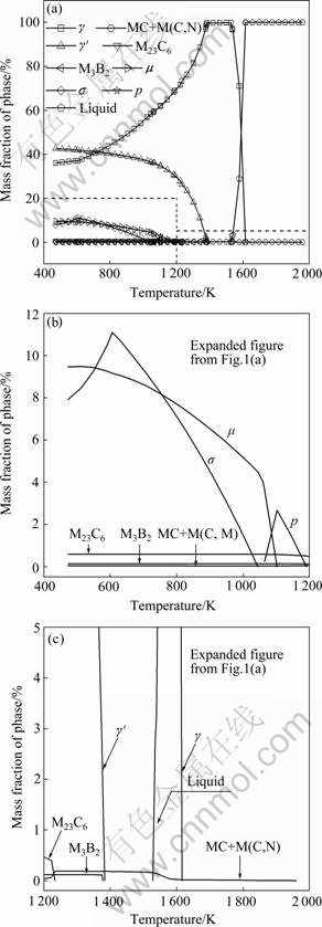 Fig. 1 Calculated equilibrium phase diagram of FGH96 superalloy (a) and expanded figures ((b), (c)) based on Thermo-Calc thermodynamic calculation software