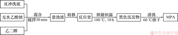 将2 g反冲洗泥、10.8 g无水乙酸钠溶于60 mL乙二醇中,搅拌30 min后,将形成的悬浊液转入100 mL聚四氟乙烯内衬高压反应釜中,拧紧釜体,密封。随后,将反应釜放入烘箱,将烘箱升温至180 ℃恒温保持10 h。待反应釜自然冷却至室温,取出底部黑色沉淀,分别用无水乙醇和去离子水交替清洗,用磁铁分离,此过程重复5~8次。将所得产物置于干燥箱中,于60 ℃下干燥6 h,得到磁性粉末吸附剂MPA,制备流程如图1所示。