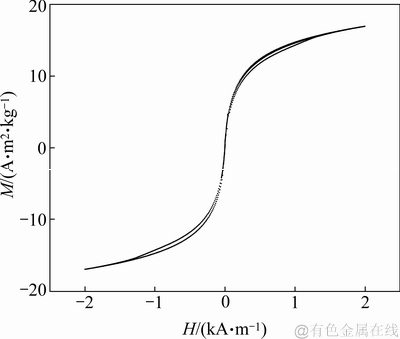 在室温下测得MPA的磁滞回线如图3所示。MPA的磁滞回线呈现典型的“S”形,其饱和磁化强度为16.95 A·m2/kg。实验制备的磁性吸附剂材料在悬浮状态下短时间内不会完全沉降,但在外加磁场的作用下,磁性材料MPA能够迅速地富集,水样变澄清,磁分离效果很好。