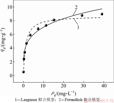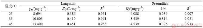 式中:qe为平衡吸附量, mg/g;ρe为平衡质量浓度,mg/L;qm为最大吸附量,mg/g;KL和KF分别为Langmuir和Freundlich吸附常数。