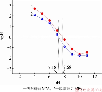 在溶液为某一特定pH时,会使得吸附剂解离出阴离子或阳离子的程度或趋势相当,吸附剂表面呈电中性,此时溶液的pH即为该物质的等电点pHpzc[18]。吸附前后等电点的变化是表征离子在吸附剂表面吸附类型的重要参数。图5所示为根据吸附砷前后的MPA得到的pH-△pH曲线。未吸附砷前MPA的等电点pHpzc1为7.68。用吸附砷后的MPA测试得到的pH- △pH曲线与△pH=0轴的交点明显向左偏移,等电点pHpzc2降低为7.18。阴离子的专性吸附会使吸附剂表面带上更多的负电荷,不同于静电吸附,这种专性吸附会导致吸附剂等电点的降低[19],故判断As(Ⅴ)在MPA 上发生专性吸附。