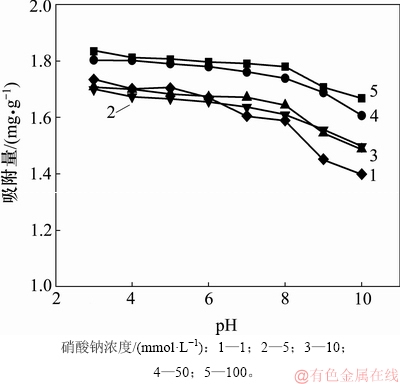 在一系列容量为250 mL锥形瓶中加入100 mL初始质量浓度为0.5 mg/L的As(Ⅴ)溶液,吸附剂投加量为0.2 g/L,溶液pH在3~10范围内,硝酸钠浓度离子分别采用1,5,10,50和100 mmol/L,在25 ℃条件下以100 r/min震荡吸附24 h后测定溶液剩余As(Ⅴ)质量浓度。