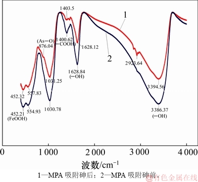 另外,在等温吸附实验中发现,吸附砷后的溶液pH均有一定程度升高。PECINI等[20]认为,砷酸盐能够取代金属氧化物表面的—OH或水分子,以配体交换的方式形成内层复合物。所以,为进一步明确MPA的除砷机理,对吸附砷前后的MPA 进行FTIR表征(如图7所示),并分析其官能团组成和成键结构。从图7可以看到:吸附砷前的MPA在波长3 386.37 cm-1处的峰为羟基的伸缩振动峰,在1 628.64 cm-1处的峰为羟基的弯曲振动峰,波长452.21 cm-1处的峰为FeOOH的吸收峰,1 400.62 cm-1处的峰为羧基的振动峰。显然,溶剂热法制备的以磁赤铁矿为主的MPA存在有多种表面羟基,它们是能发生离子交换的重要结构,且有一些未转化的FeOOH也能发挥吸附效能。吸附砷后,3 386.37 cm-1和1 628.64 cm-1处振动峰的降低,且1 400.62 cm-1处的羧基振动峰减弱,此外,在波长876.04 cm-1处显现出微弱的As—O键伸缩振动峰,这是吸附过程中含羟基结构与As(Ⅴ)结合在MPA表面形成砷酸铁所致[21-22]。由此判断MPA同大部分金属氧化物一样,其表面的—OH2或—OH与As(Ⅴ)进行离子交换并络合形成Fe—O—As键,发生专性吸附,吸附后溶液pH升高与—OH被砷酸盐取代进入溶液中有关。