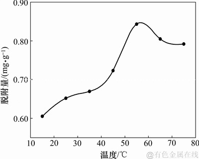 采用质量分数为1%的氢氧化钠再生液,脱附温度在15~75 ℃范围内以10 ℃为间隔,每个温度下在以130 r/min的转速恒温震荡。震荡脱附3 h后取水样,测定水中砷质量浓度,计算脱附量。