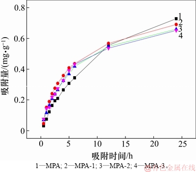 称取0.8 g MPA置于容量为1 L的聚乙烯瓶中,加入800 mL质量浓度为1 mg/L的As(Ⅴ)溶液,在25 ℃下以130 r/min的转速恒温振荡。自反应开始至24 h,以一系列不同的时间间隔取水样,每次1 mL,测定砷质量浓度。同理使用一次再生材料(MPA-1)、二次再生材料(MPA-2)以及三次再生材料(MPA-3)测定动力学。