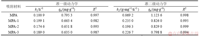 式中:t为反应时间,h;qt为在t时刻MPA吸附砷的量,mg/g;qe为吸附平衡时MPA吸附砷的量,mg/g;k1和k2分别为准一级和准二级动力学方程的速率常数。