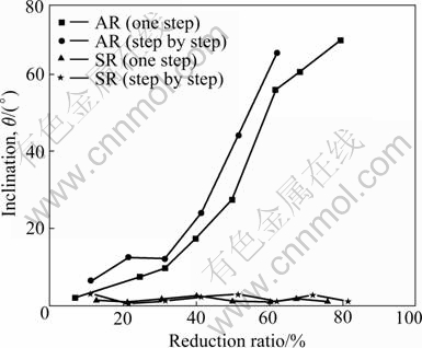 Fig.2 Relationship between reduction ratio and inclination under different rolling modes (AR: Asymmetric rolling; SR: Symmetric rolling; One step: One pass to the final reduction; Step by step: Each pass of 10% reduction up to final reduction)