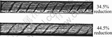 The relationship between inclination of lineation and reduction ratio is shown in Fig.2. In Fig.2, during asymmetric rolling process, inclination of lineation increases to 68.7? when the reduction ratio is up to 79.3%; while in conventional rolling, the inclination is still negligible. When the reduction of material still goes on, the lineation scratched on the side face of internal mark block becomes vague and illegible. However, the trend that the inclination increases with reduction ratio is obvious. And this represents the fact that shear deformation that is believed to be the critical reason of grain refinement[3] also increases with reduction ratio.