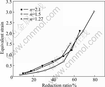 where d0 and d are the thicknesses of the sheet before and after asymmetric rolling, and θ is the apparent shear angle at a given position of the element perpendicular to the surface of the sheet before rolling. According to the calculation above, we can transfer the inclination into equivalent strain and then contact the total strain with reduction. Such results are shown in Fig.4, in which three kinds of mismatch ratios are carried out. The ratio means the rotating speed ratio of the upper roller to lower roller. This reveals that the inclination of scratches tends to be much smaller when the mismatch ratio is 1.5. The reason why mismatch ratio of 1.5 is less capable of bringing shear deformation than that of 1.27 and 2.1 is not yet understood.