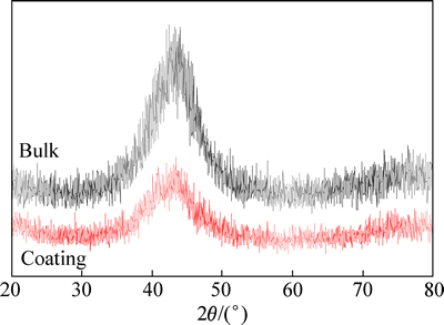 图1所示为Fe41Co7Cr15Mo14C15B6Y2块体非晶合金与非晶合金涂层(以下分别简称块体与涂层)的XRD谱。由图1可知,两者在40°到45°之间都只有一个弥散的漫散射峰,而无其他尖锐的衍射峰,证明两种样品为完全非晶态结构。