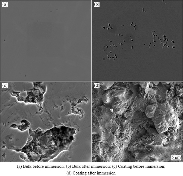 Fig. 2 SEM images of bulk metallic glasses and amorphous coating before immersion and after immersed in 1 mol/L HCl for 480 h