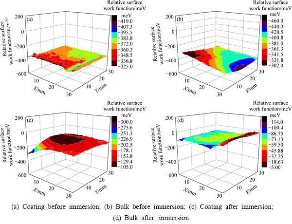 图3 块体与涂层在1 mol/L HCl浸泡前和浸泡480 h后相对表面功函数