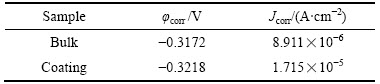表1 块体与涂层在0.5 mol/L H2SO4中的极化曲线拟合结果
