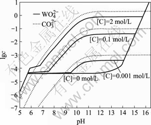 的lg c—pH图。利用这些热力学平衡图对Na2CO3分解白钨矿的工艺条件进行了分析,认为溶液中