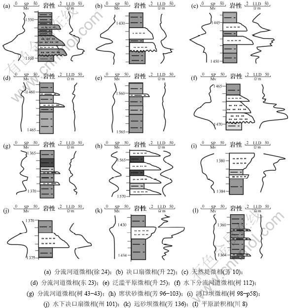 (2) 确定研究区姚家组一段为浅水三角洲沉积,其中三角洲平原、三角洲前缘广泛发育,前三角洲不发育。进一步分出分流河道、天然堤、决口扇、分流河道间、泛滥平原、水下分流河道、水下分流间湾、水下决口扇、河口坝、远砂坝和席状砂11种沉积微相。