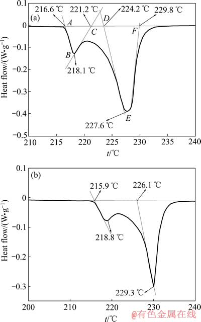 Fig. 2 DSC curves of SCA solder (a) and Ni/SCA composite solder (b)
