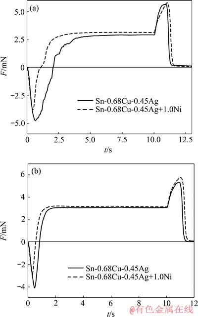 图3(a)所示为SCA基体钎料和Ni/SCA复合钎料在240 ℃的润湿性曲线。由图3(a)可以看出:复合钎料的润湿时间为1.263 s,较基体的润湿时间1.66 s缩短了31%;其润湿力为5.61 mN,较基体的润湿力提高了3.8%。