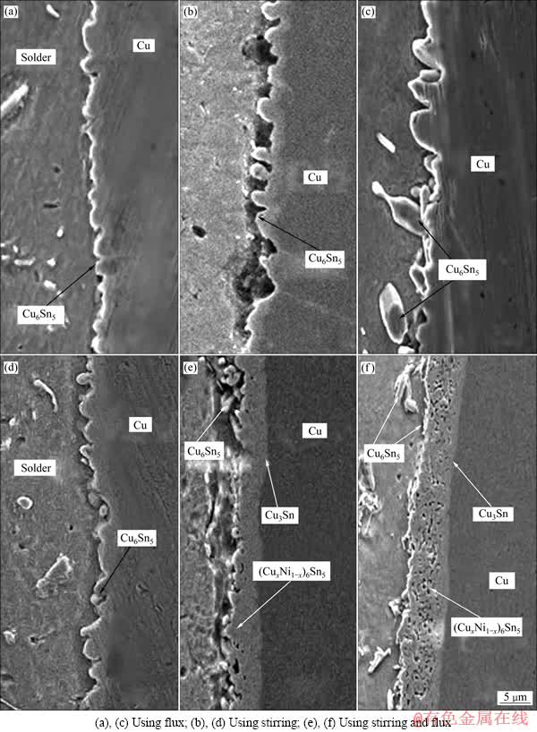 对比图5(a)和(c)可以发现,纳米Ni的添加有利于粗条状Cu6Sn5的细化;从图5(c)和(d)可以看出,搅拌有利于孔洞状的(CuxNi1-x)6Sn5生成和其他化合物的破碎。