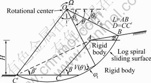 In this work, a rotational failure mechanism following a log-spiral slip surface is shown in Fig.1, where β' is the angle related line CC′ to line AC′; θ0 is the angle related horizontal line to line OB; and θh is the angle related horizontal line to line OC′. This mechanism, which is considered by CHEN [2], is geometrically defined by angles α, β, β', θ0, θh and the mobilized internal friction angle φt.