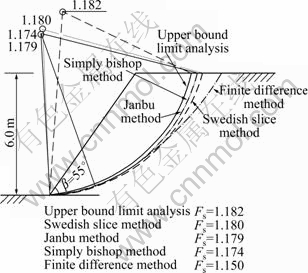 An embankment slope example based on linear failure criterion was cited to illustrate the validity of this method. The parameters in this example are as follows: slope height H=6 m, slope top gradient α=0?, slope foot gradient β=55?, soil bulk density γ=18.6 kN/m3, cohesion force c=16.7 kN/m2 and internal friction angle φ=12?. Comparisons were made with different methods (simplified bishop method, Swedish slice method, Janbu method and finite difference method) on safety factor and latent slip surface, which are outlined in Fig.2.