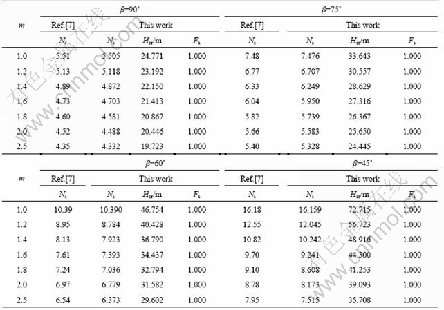 To show the validity of the present approach under the assumption of nonlinear failure criterion, the example, in which τ0=90 kN/m2, σt=247.3 kN/m2 were used by ZHANG and CHEN [7], was chosen like other authors including DRESCHER and CHRISTOPOULOS [8], COLLINS et al [9], YANG and YIN [10] and LI [13]. Table 1 shows a comparison of stability factor Ns obtained by ZHANG and CHEN [7] with the results of stability factor Ns, critical height Hcr and corresponding safety factor Fs computed by the present solution. For the cases analyzed, seven values of nonlinear parameter m are taken into account from 1.0 to 2.5 and four slopes are considered with slope foot gradient β varying from 45? to 90?. In addition, slope top gradient α=0? and soil bulk density γ=20.0 kN/m3 are considered at the same time.