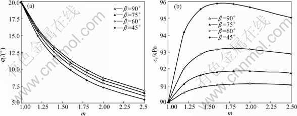 The corresponding effects of nonlinear parameter m on mobilized internal friction angle φt and the intercept of tangential line on τ-axis ct are shown in Fig.3.