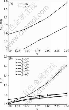 Fig.5 Critical failure surfaces coefficients (L/H and D/H) versus nonlinear parameter (m) for different slopes: (a) β=30?; (b) β=30?-90?
