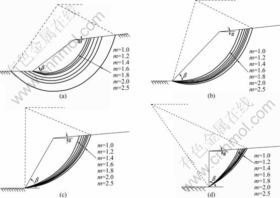 Fig.6 Comparison of potential sliding surface based on nonlinear failure criterion for different β values: (a) β=30?; (b) β=40?; (c) β= 60?; (d) β=90?