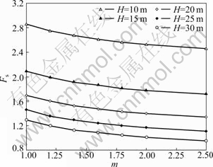 Fig.7 Effect of nonlinear parameter m on safety factor Fs for different slopes with H varying from 10 to 30 m